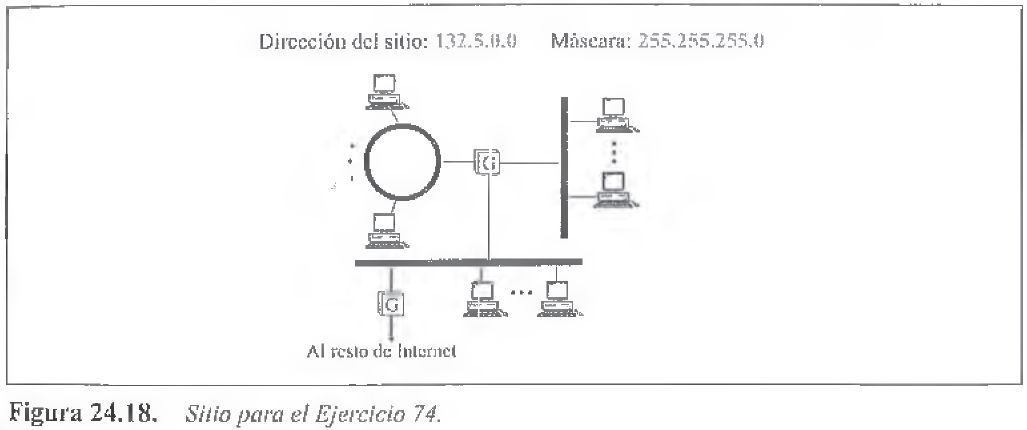 75. La Figura 24.19 muestra un sitio con una dirección de red y una máscara determinada La administración ha dividido el sitio en varias subredes. Elija de forma adecuada las direcciones de las subredes, las direcciones de las estaciones y las direcciones de los encaminadores.